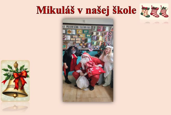 Aj tento rok zavítal do našej školy Mikuláš. Spolu so svojím sprievodom prechádzal po triedach, kde ho deti s radosou privítali. iaci mali pre Mikuláša krásne pripravený program – recitovali básničky, spievali piesne, ukázali svoje kresby a na záver nechýbal ani veselý tanec.