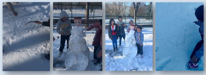 Počas zasnežených dní sa náš školský dvor premenil na tvorivú galériu pod holým nebom. Deti sa s veľkým nadšením zahrali na snežných sochárov a spoločne postavili veselého snehuliaka. Pomocou konárikov kreslili do snehu rôzne obrázky vznikali srdiečka, domčeky aj ďalšie originálne tvary. Aktivity boli prepojené aj s učením deti počítali, porovnávali a spolupracovali, čím si prirodzene rozvíjali svoje schopnosti. Pobyt vonku, tvorivosť a radosť zo snehu vytvorili príjemnú atmosféru a nezabudnuteľné zážitky.